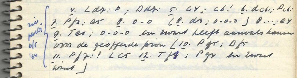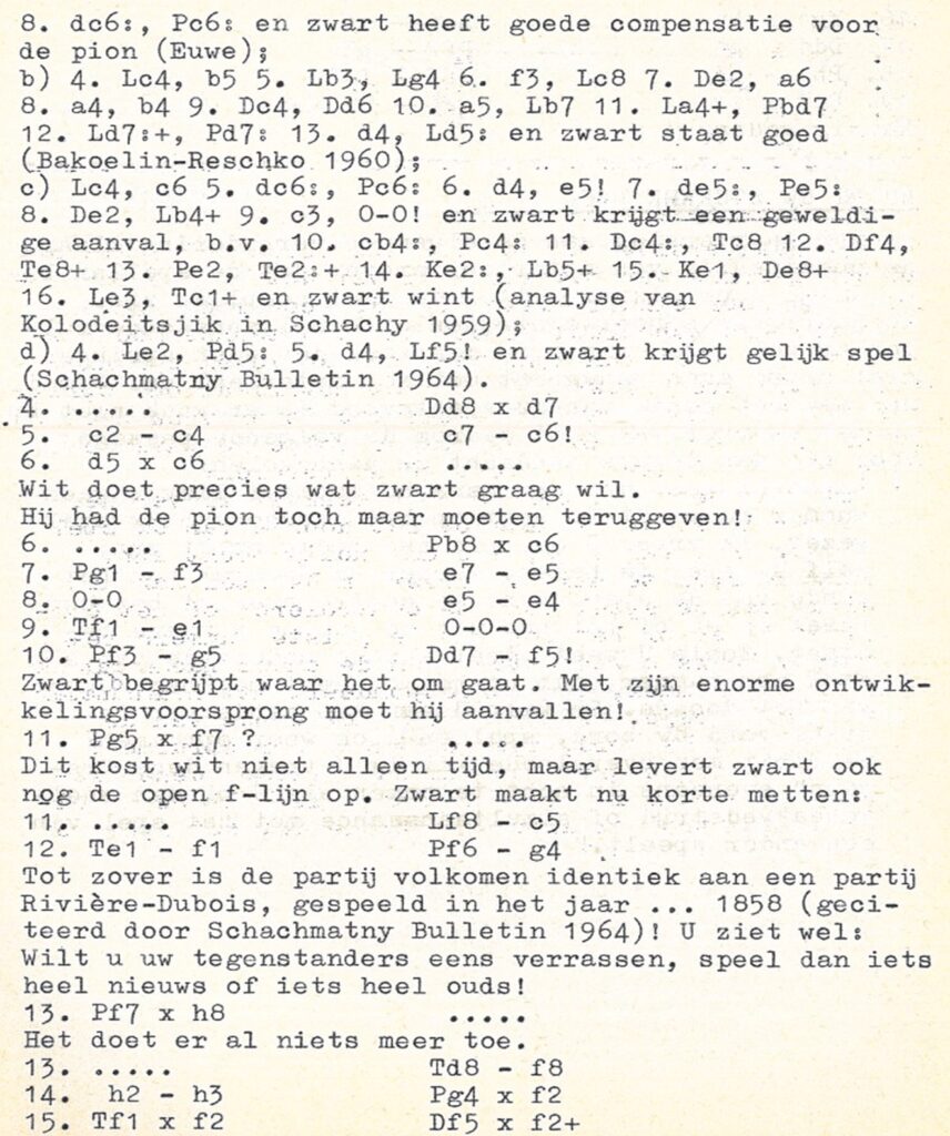 Al gauw bleek mij dat ik, als ik daar iets wilde bereiken, een openingskeuze zou moeten doen die niet zo bekend was. Ik koos voor het Scandinavisch en abonneerde mij op Schachmatny Bulletin, waarin ik heel veel over het Scandinavisch vond. Ik nam veel van die analyses over in een schriftje, waaronder het onderstaande: