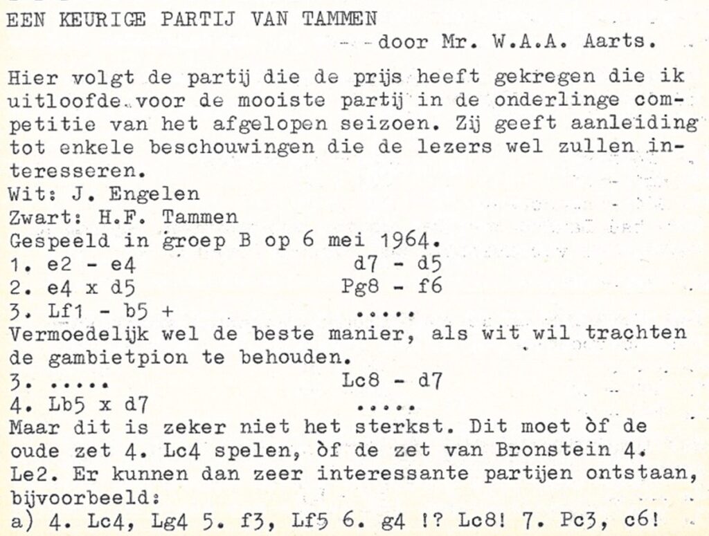 Tot zover Mr. W.A.A. Aarts, destijds een vooraanstaand schaker bij het HSG, in het clubblad “De Schakel”.