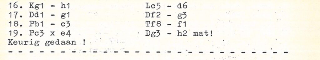 Deze analyse paste ik toe in een partijtje voor de onderlinge competitie en omstanders vonden dat ik die partij moest voordragen voor de prijs voor de mooiste partij in de onderlinge van dat jaar. Zo gezegd zo gedaan, het resultaat tref je onderstaand aan: