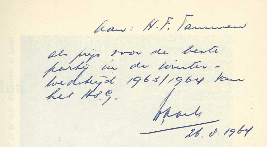 Ik was de partij, inclusief bovenstaande bespreking, helemaal kwijt. Mijn notatieboekje uit die tijd had ik nog, maar de betreffende partij was daaruit verwijderd. Alleen het schriftje en de prijs (een boek over het toernooi dat in 1936 in Nottingham gehouden werd) waren tastbare herinneringen aan mijn schaakpartij. Onderstaand de opdracht van Mr. Aarts in het betreffende boek: