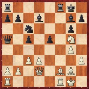 20…Pe7 [Na 20…h6 volgt 21.Ld5+ Kh8 22.Pf7+ Kh7 23.Le3 en zwart zit in de hoek waar de klappen vallen.] 21.Lxb7 Tab8 22.Lg2 Lh6 23.Le3 Txf1+ 24.Kxf1 Db5 25.b3 [Tijdens de partij dacht ik voldoende compensatie te hebben. Toch lukte het me niet om een betere voortzetting te vinden als in de partij. Zwart blijft een pion achter.] 25…Lc6 26.Lxc6 Dxc6 27.Pe4 Tf8+ 28.Kg1 Lxe3+ 29.Dxe3 Pd5 30.Dxc5 Dxc5+ 31.Pxc5 Pxc3 32.Pd7 Pe2+ 33.Kg2 Pf4+ 34.Kf3 Td8 35.Pxe5 Pxd3 36.Pc4 Tf8+ 37.Kg3 Kg7 38.Td1 Pc5 39.Pd6 Kh6 40.Td5 Pe6 41.Pe4 Tf7 42.g5+ Kg7 43.h4 Pf4 44.Td2 Ph5+ 45.Kh3 Tf3+ 46.Kg2 Tf4 47.Td7+ Kg8 48.Pf6+ Pxf6 49.gxf6 Txh4!