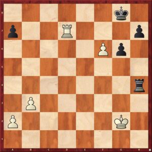 50.Txa7 [De laatste zet van wit is wat slordig. Met 50.Kg3 wordt de zwarte toren van veld f4 afgehouden. Zwart moet dan als volgt spelen: 50…Tb4! 51.f7+ Kf8 52.Txa7 Tb6 53.Kg4 Tf6 Na 54.a4 volgt dan 54…Tb6 en op een andere zet volgt slaan op f7.] 50…Tf4 51.Ta6 Kf7 52.Ta7+ Kg8 53.Tb7 Txf6 54.a4 Ta6 [Practisch gedwongen. De witte pionnen kunnen anders niet op tijd gestopt worden.] 55.Kg3 h5 56.Kh4 Kf8 57.Kg5 Ke8 58.Tb5 Kd7 59.a5 Kc6 60.Te5 Kd6 61.Kf4 h4? [Schaakblindheid! Er moet echter gezegd worden dat ook na bijv. 61…Kc7 62.Ke4 de remiseweg voor zwart erg moeizaam te vinden is. Dit komt door de betere positie van de witte koning en toren.] 62.Tg5 Ke7 63.Kg4 Kf6 64.Tb5 Ke7 [Er dreigde 65. Tb6+] 65.Kxh4 Kd7 66.b4 Te6 67.Kg5 Kc7 68.Tc5+ Kb7 69.b5 Td6 70.Te5 Kc7 71.Kh6