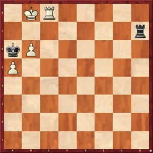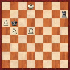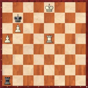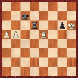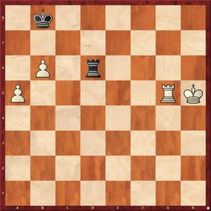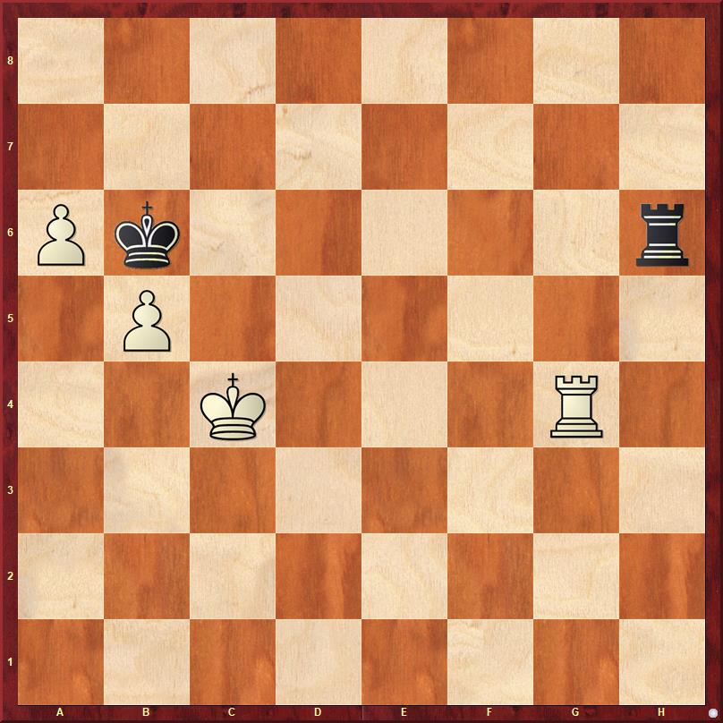 Vervolg van de partij na 71…Kb8 72.b6!! [De eerste verrassing. Het direkt opspelen van de b-pion had ik niet eens bekeken. Hoe kom ik nu in de geanalyseerde varianten terecht?] 72…Tc6 [Zwart kan niet 72…Td1 spelen, vanwege 73.a6 en het is meteen uit door de permanente dreiging van mat op de onderste rij.] 73.Te7 Td6 74.Tg7 g5+ 75.Kh5 g4 76.Txg4 Kb7 77.Tg7+ Kb8 [Op 77…Ka6 volgt 78.Ta7+] 78.Tg6 Td5+ 79.Tg5 Td6