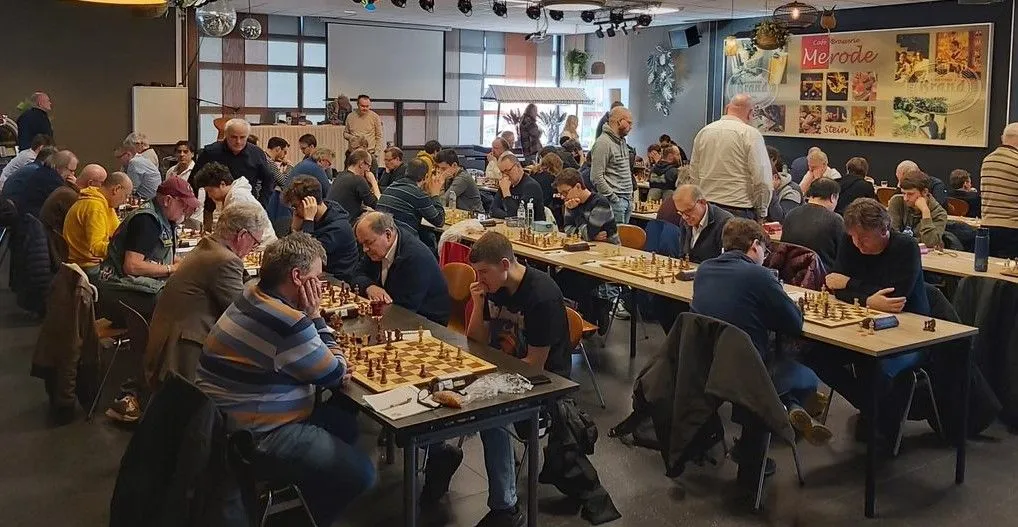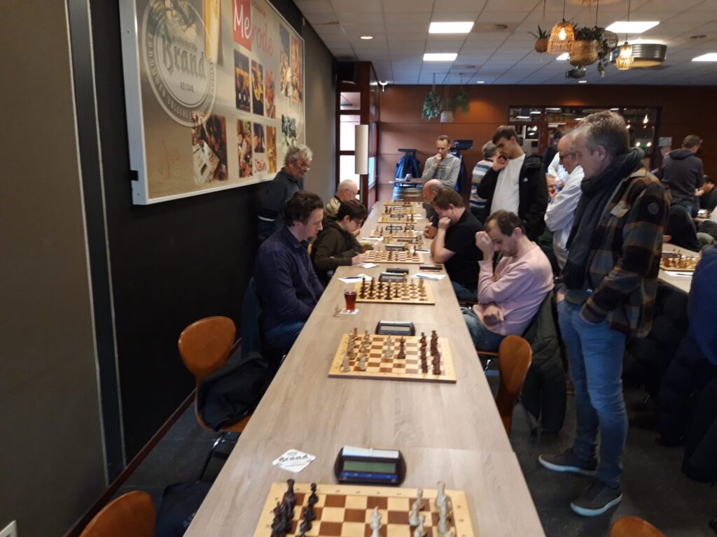 Zaterdag 2 maart speelden we onze laatste thuiswedstrijd van dit seizoen in de Merode, het clublokaal van DJC. Altijd weer een belevenis om met alle teams van Zuid Limburg gelijktijdig op dezelfde lokatie te spelen! Onze niet te onderschatten tegenstander was HSC Helmond 1, dat afgelopen december ons 4e team nog had weten te verschalken. Met name hun bezetting op de top borden is sterk en hun relatief lage positie op de ranglijst is dan ook enigszins verrassend te noemen.