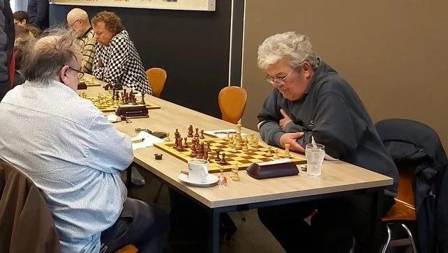 Aldus bij de tussenstand van 3-3 moesten Henk en Jozef de bal over de streep trekken. Henk had goed gespeeld, zelfs een remiseaanbod van zijn tegenstander geweigerd, en een eindspel bereikt dat hem normaliter wel toevertrouwd is. Met Pe2? dacht Henk een belangrijke pion te winnen maar na Kf1 was de onthutsing groot want door de penning op de e-lijn ging een toren verloren. Henk speelde nog moedig door maar de winst kon de witspeler eigenlijk niet meer ontgaan. Oeps, oeps.