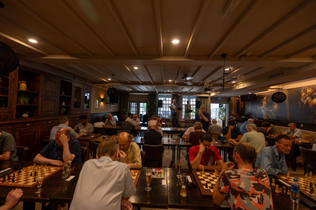 Met dit toernooi houden ze de herinnering aan een mooie schaker en een mooi mens in ere. Huub heeft veel betekend voor de NBSB (jarenlang voorzitter), Dubbelschaak en De Waltoren (zoals de club heette voor de fusie met De Gestelse Pion). Naast zijn liefde voor de houten poppetjes was Huub ook breed geïnteresseerd in cultuur en dat proberen de organisatoren terug te laten komen in het toernooi. Elk jaar is het weer een verrassing wat er naast het schaken op het menu staat. Op zaterdag 24 juni stond de 10e editie alweer op de agenda. Het muzikale duo, met de toepasselijke naam, ‘Two of Us’ zorgde voor de culturele inslag. Heerlijke muziek, van vooral de Beatles, Simon & Garfunkel en andere helden van weleer, klonk er tussen de partijen maar ook tijdens de partijen. Zelf vind ik dit een fantastisch concept. Lekker potje schaken en ondertussen de liedjes mee neuriën. Een leuk noemenswaardig feitje is dat de muzikale heren, Jos en Adrie, zwagers zijn van Huub. Daarnaast is ook altijd Pieternel aanwezig, de partner van Huub. Zelf schaakt ze niet maar komt toch elke keer weer naar het toernooi toe om iedereen aan te moedigen en oude relaties weer te ontmoeten. Leuk Pieternel, ik hoop dat je nog jaren bij het toernooi betrokken blijft!