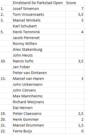 Na drie ronden was er een half uur pauze en waren alleen nog Jozef Simenon en Tom Vrouenraets met een 100% score.