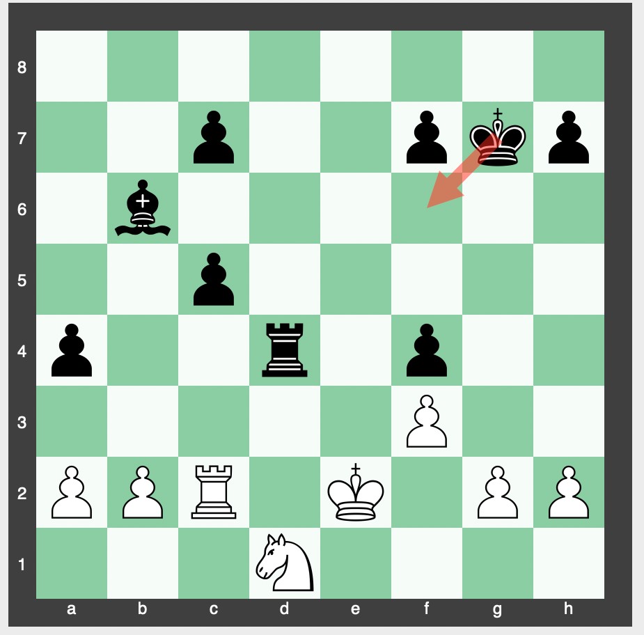 Daarna kon ik de koning bij de aanval betrekken. Zwart bleef actief spelen, probeerde mijn koning in te snoeren, maar nam met c6 waarschijnlijk een initiatief teveel.