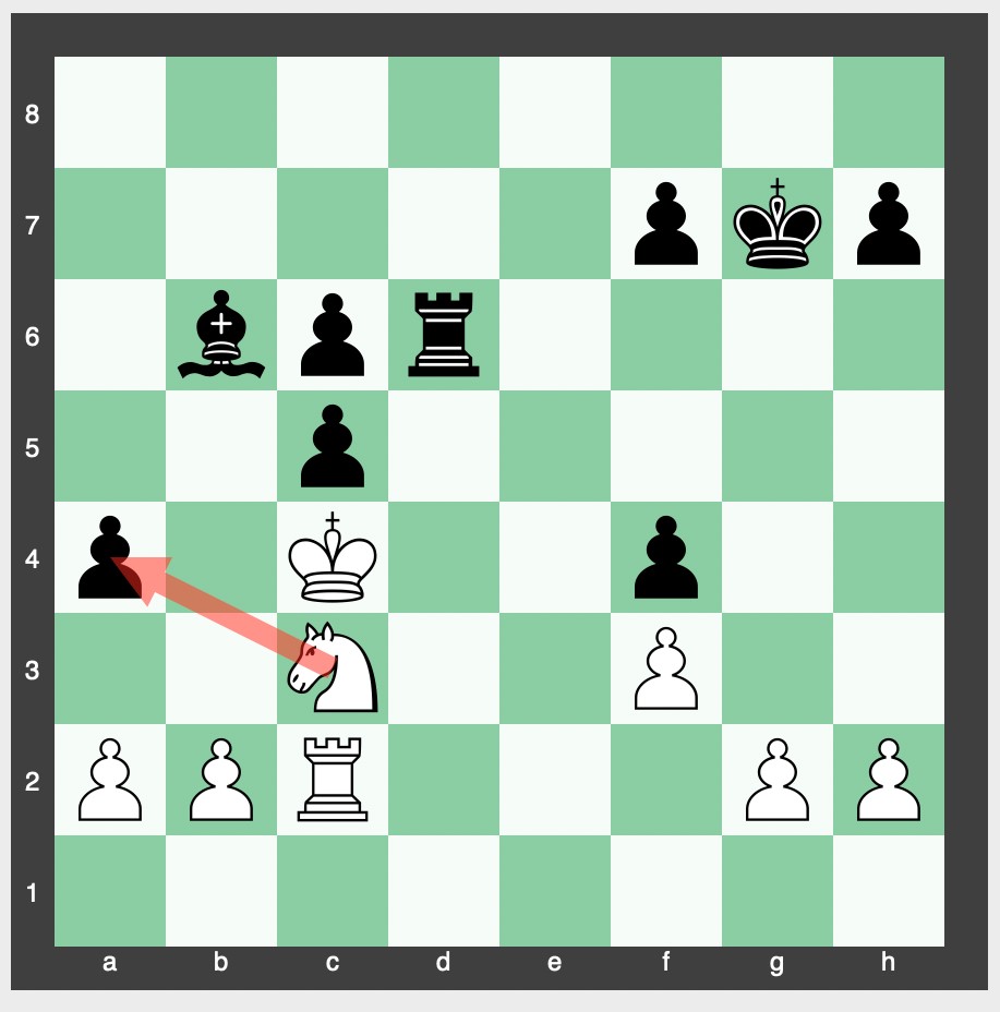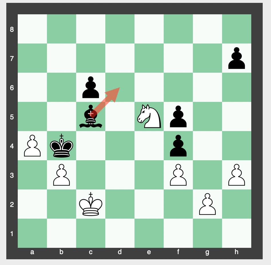 Ik kon de a-pion winnen en hield een eindspel over van een sterk paard tegen een zwakke loper. Zwart gaf uiteindelijk in bijgaande stand op.