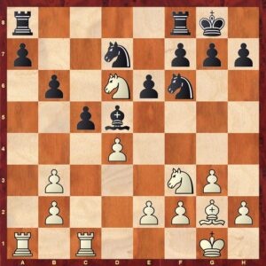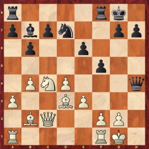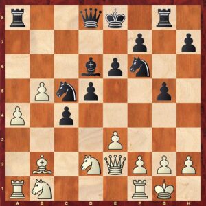 Bord 3: IM Mark van der Werf (2388) – FM Siem van Dael (2271) Ikzelf speelde op bord 3 met zwart tegen een tegenstander waar ik al vaker tegen had gespeeld. De opening ging vrij stroef en Mark leek goed voorbereid. Na enige mindere zetten had ik kans om een klein voordeel te krijgen door op zet 17…Qxd2 in te lassen voor het terug slaan op b5 (zie partij fragment).