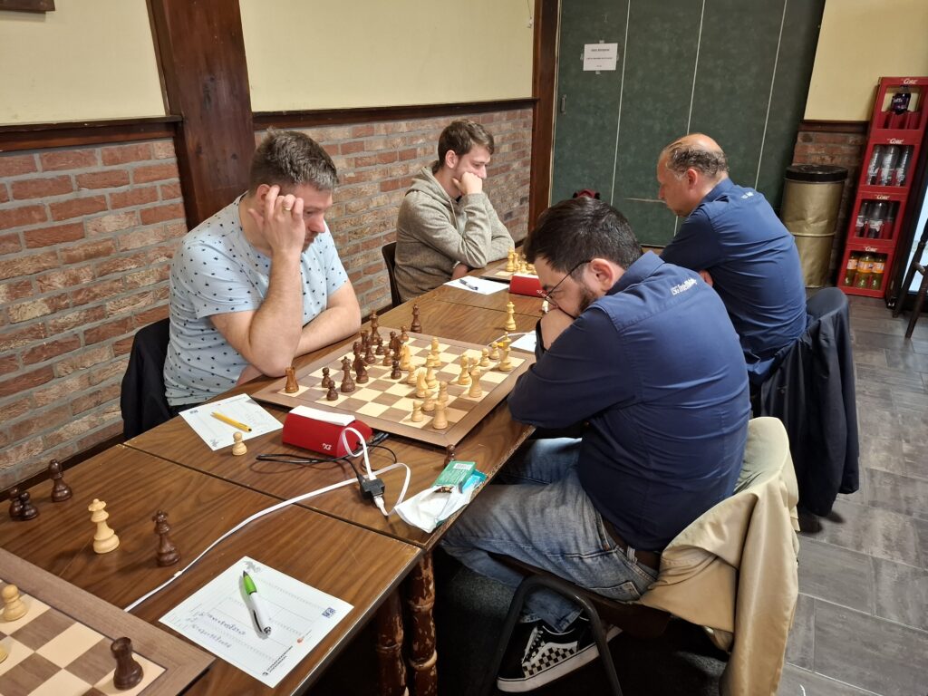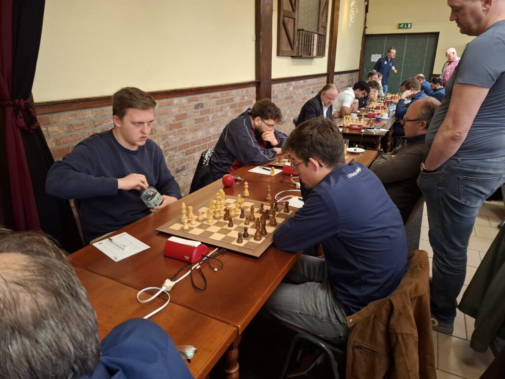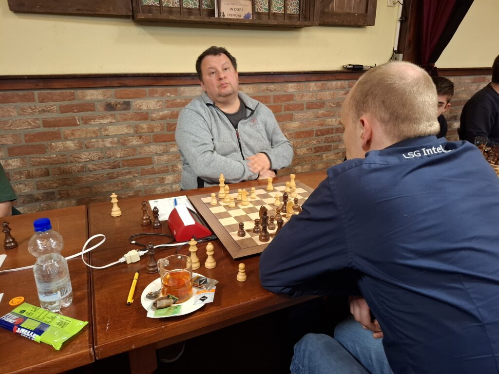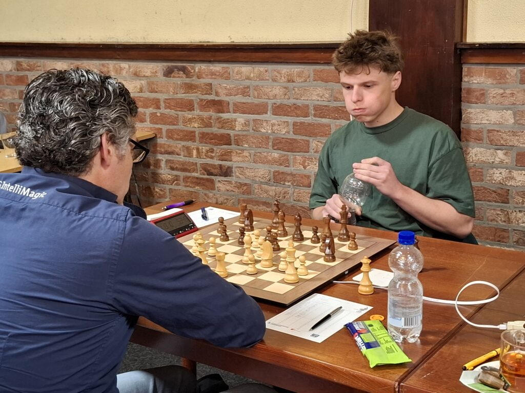 Op het eerste bord en ook als eerste klaar was de partij tussen Edwin en onze jonge Duitser Luca. De partij ging erg gelijk op en er gebeurde niet veel, na de opening had Edwin een normaal openings-voordeeltje maar besloot al vrij snel op zet 17 remise aan te bieden, Luca leek tevreden en nam het aanbod aan. ½ – ½