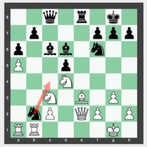 En in deze positie kon ik het pionoffer brengen. Na 7. d4 cxd4 8. cxd4 Pxe4 9. d5 Pe5 10. Te1 Pxf3+ 11. Dxf3 Pf6 12. Pc3 bereikten we onderstaande stand.