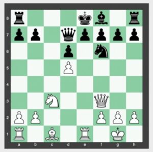 En na het nodige denken speelde mijn tegenstander prompt 12…g6!?? en verloor na 13. Dxf6 een vol stuk! Er volgde nog 13. Dxf6 Tg8 14. Df3 O-O-O 15. Dxf7 en zwart gaf gedesillusioneerd op.