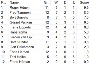 Wat mijzelf betreft: eindelijk weer eens een goede score. Ik begon aan de laatste ronde met 7 uit 9 en dan weet je dat je de sterkste tegenstanders krijgt. Roger wint (steeds) van mij door mij een kleine verzwakking te bezorgen en dat zodanig uit te melken dat er maar één ding overblijft: opgave. Tegen Bert (Smeets) kreeg ik behoorlijke kansen, die ik door geconcentreerd te blijven spelen wellicht had kunnen benutten. Hoe dan ook: Bert won deze partij. Bert heeft een foto van de kritieke stelling gemaakt, zal mij die toesturen zodat wij kunnen onderzoeken wat er echt aan de hand was. Misschien iets voor een volgende nieuwbrief.