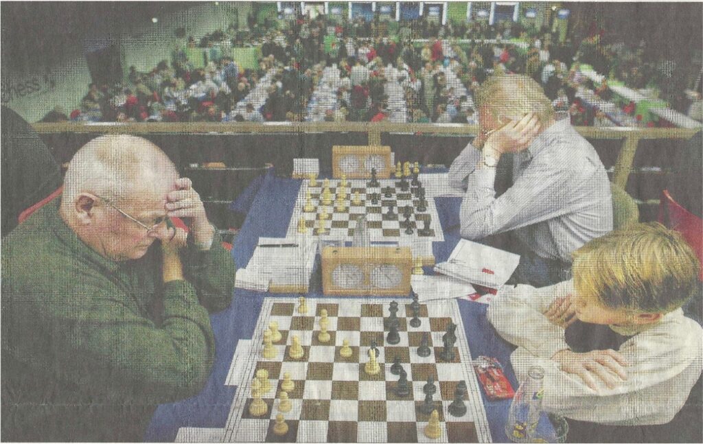 Tot zover mijn inhaalslag. Nu even wat anders: het Hoogovenschaaktoernooi begint weer. Ik kan het niet nalaten om het Corus/Tata zo te noemen. Het begint op 16 januari en eindigt op 1 februari 2026. In mijn jongere jaren heb ik vaak meegedaan met het Hoogovenschaak-toernooi. Bij één van mijn deelnames zat mijn groep op het balkon, een mooie plaats om een overzichtsfoto te maken die in de Volkskrant gepubliceerd werd. De volgende dag kwamen mijn groepsgenoten mij vertellen dat mijn tegenstander en ik op de voorpagina stonden. Mijn tegenstander was een jochie van een jaar of 14, ik ben zijn naam vergeten. Ik speelde de Colle-Zukertort met een offer op h7, zoals je op de foto kunt zien en won die partij na een langdurige gevecht. Dat “jochie” ben ik later nog tegengekomen in een toernooi in Amsterdam. Hij speelde toen al in de hoogste groep.