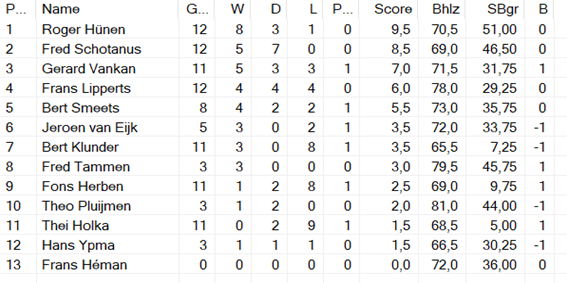 Zoals gebruikelijk heeft Roger deze periode winnend afgesloten. Verder valt de hoge score van voornaamgenoot Fred Schotanus op, die Roger een aantal remises afgedwongen heeft. En mijn score, 3 uit 3. Mijn tegenstanders waren kennelijk blij met mijn hernieuwde aanwezigheid en maakten het mij niet al te moeilijk.