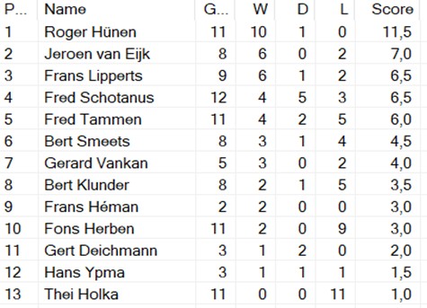 Mij vallen de resultaten van Jeroen van Eijk op. 7 uit 8 is echt heel goed, hij speelt zo solide dat ik (opportunistisch schaker) het niet meer tegen hem redt. Jeroen is nu even een poosje afwezig, dus ik heb de tijd om iets anders te verzinnen om kans te maken.