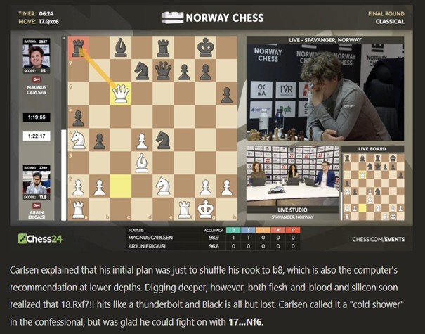 Dan nu naar een recente partij van Carlsen tegen Erigaisi, één van de vele Indiase toppers. Menigeen dacht dat Pef6 een blunder van Magnus was, maar dat bleek niet het geval.