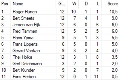 Je ziet, dat niet iedereen 12 partijen gespeeld heeft. Roger kijkt gewoon wie er is en maakt op grond daarvan de indeling. En wint meestal daarna al zijn partijen op een enkele remise of nederlaag na.