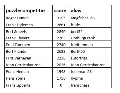 De ratingcijfers (zie onder de score) komen uiteraard niet overeen met de KNSB rating. Die zijn veel lager. Ook hebben niet alle deelnemers evenveel puzzels opgelost.