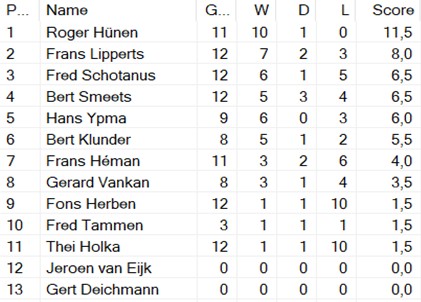 Verder dat Frans (Héman) en Thei alle keren aanwezig waren. Misschien komt dat mede door mijn verzoek aan Frans om Thei mee te nemen bij mijn afwezigheid. Maar vermoedelijk ook omdat Frans graag schaakt en nu vlakbij Thei woont (als Frans in Nederland is). Hoe dan ook, bij voorbaat dank, Frans.