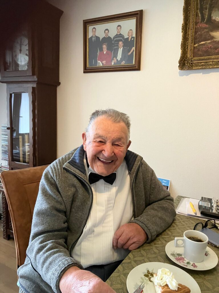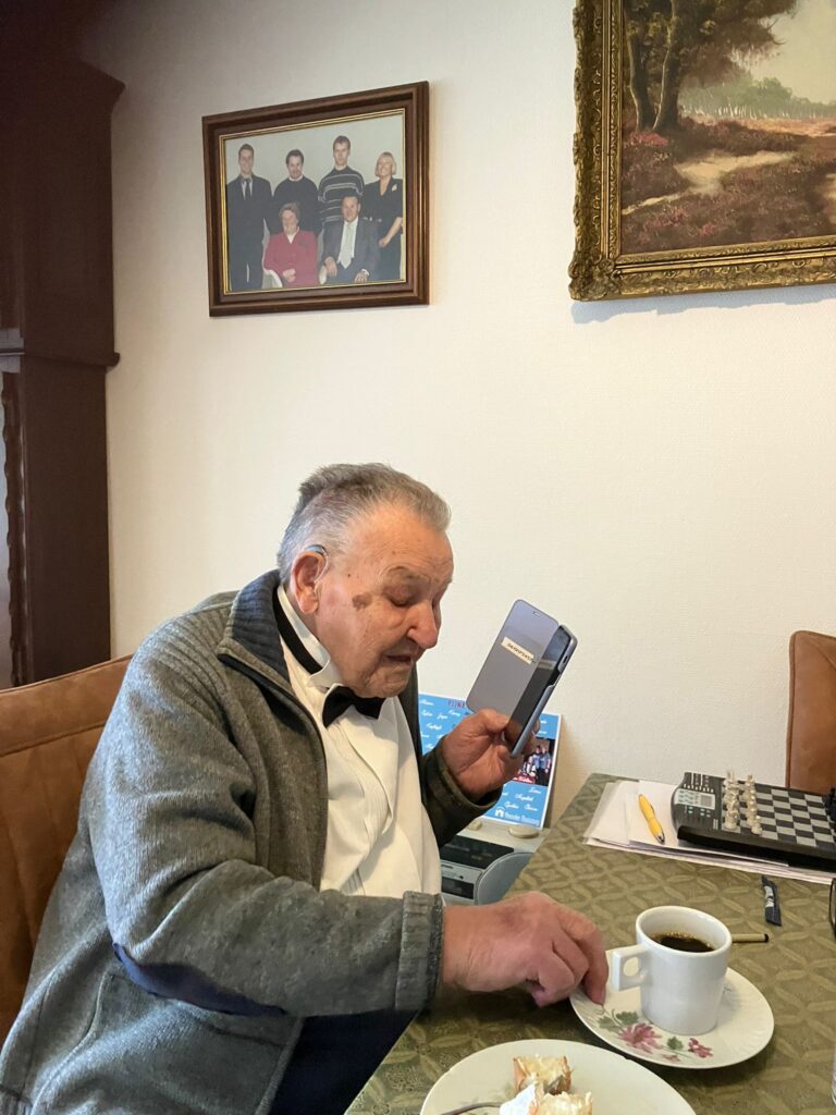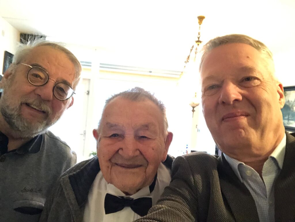 Met een ongekend flinke portie rijstevla werden onze bestuursleden Luc Zimmermann en Ilmar Woldring vanochtend gastvrij door Thei Holka onthaald in diens knusse appartement, in een groot flatgebouw nog net binnen de Heerlense stadsgrens. Helaas kon de burgemeester niet komen, maar dat wordt aanstaande woensdag ingehaald. Een uurtje levendig babbelen met een energieke Thei leverde naast allerlei leuke herinneringen van zijn kant ook nieuwe, dat wil zeggen ons onbekende informatie op. Wie wist dat Thei elke dag begint met twintig minuten rek- en strekoefeningen? En dat hij als het niet regent de deur uitgaat om een kilometer of drie te wandelen? Nou, chapeau! En dat hij nog steeds auto rijdt, maar dat daaraan over enkele maanden een einde komt? De ogen doen het weliswaar nog goed, maar het wordt onze eeuweling onderhand toch te hectisch allemaal. Dus: geen rijbewijsverlenging.