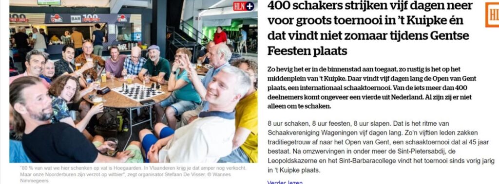 Per dag spelen we 2 partijen m.u.v. de laatste dag waarop slechts 1 partij gespeeld wordt.  Rond 17 uur zijn de meesten wel klaar met de middagpartij en dan is het haasten om ergens wat eten te krijgen. Frietkot “De Gouden Saté” is dan the place to be omdat je daar een gedegen hoeveelheid lekkere calorieën naar binnen kan slaan als basis voor de avond-analayse. De laatste jaren moet je wel enig geluk hebben want de uitbater gooit steeds vroeger in juli de zaak op slot en gaat dan met zijn Lamborghini op vakantie naar Italië. Het frietkot is een ware goudmijn. Hij verdient door het jaar meer dan genoeg aan de hongerige studenten van de Gentse Universiteit zodat hij de opbrengst van de Feesten niet nodig heeft. Als hij de zaak op slot doet moeten we in het frietkot naast De Gouden Saté gaan eten maar dit is toch een stuk minder lekker. Zwetende Tonio doet daar wel zijn best maar zijn frieten liggen me toch zwaar op de maag.  Als ik daarna moet gaan schaken gaat veel energie verloren aan de vertering van te ver doorgebakken kip in looksaus Daardoor lijkt het alsof je de avondpartij in het nadeel begint maar je kan er donder op zeggen dat je tegenstander niet veel beter gegeten heeft. Kansen volop voor de speler die er tegenaan durft te gaan. De avondpartij begint om 19 uur en rond 23 uur heeft iedereen wel al zijn zetten gedaan. In de aangrenzende bar zitten dan aan elke tafel hordes schakers rondom een bord te kijken naar een partij die één van hen gespeeld heeft. Terwijl vele handen over het schaakbord schieten op zoek naar betere voortzettingen vloeit het bier rijkelijk. Voordat überhaupt één schaker naar de stad gaat om Gents te Feesten ontstaan in de speelzaal al Bourgondische taferelen. Ik werd twee maal het slachtoffer van een bierbad, het onbedoelde neveneffect van een te enthousiast uitgevoerde analyse die leidt tot het omstoten van glazen waardoor één van de disgenoten met natte kleren eindigt. Men moet hier ook niet vreemd opkijken als barkeeper Stefaan, de beste DJ van Gent en omstreken, een spontane dansexplosie initieert. Als “Malle Babbe” uit de luidsprekers schalt springen alle schakers als door een wesp gestoken op en beginnen mee te zingen en te springen. Dat kan alleen op het schaaktoernooi in Gent.  Dat soort zaken was ook de verslaggever van Het Laatste Nieuws, de Belgische evenknie van De Telegraaf, ter ore gekomen.   Die heeft er nog een mooi artikel over geschreven in de krant van 19 juli 2023 waarvan hieronder een screenshot is weergegeven.