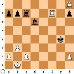 In bovenstaand diagram speelde Thei 1. h2-h3!? Fons dacht niet lang na en nam die randpion 1…Kg4xh3 En er volgde 2. Tf7xc7 Ld6xc7 en 3. Th8xh7+ met stukwinst na 4. Th7xc7.