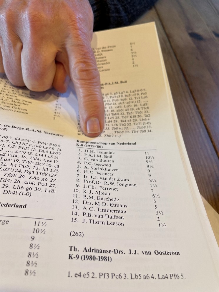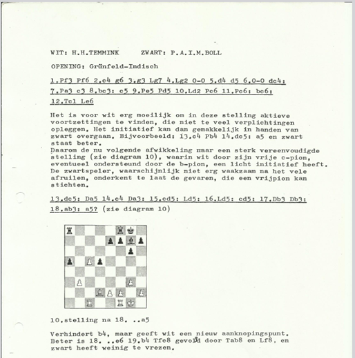 Dat is een correspondentiepartij tegen Peter Boll in 1979/1980 voor het 8e Nederlands kampioenschap. Ik won die partij en werd daardoor met 11 uit 14 Nederlands kampioen. Peter Boll werd tweede met 10,5 punten. Het was een cruciale partij!