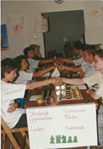Ik heb ook altijd graag schaakles gegeven. Dat deed ik bijvoorbeeld op Rolduc en Heyendal. Trots ben ik nog steeds op de prestaties van deze schoolteams. Rolduc werd in 1988 2e in het Nederlands kampioenschap voor V.W.O.’s en Heyendal is zelfs een keer Nederlands kampioen geworden bij de M.A.V.O. scholen.