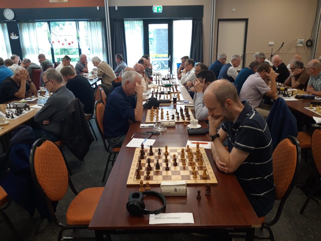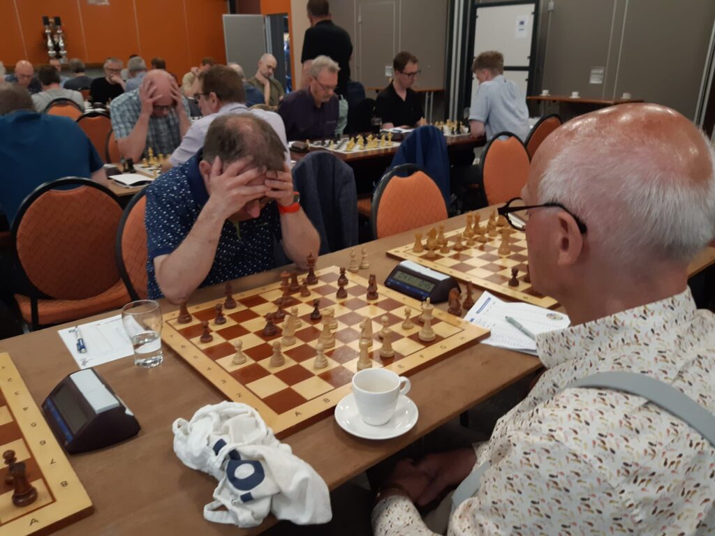 Voor drie uur is het dus al 1.5 – 0.5 voor ons in deze wedstrijd om des keizers baard. Reuver is al gedegradeerd, wij kunnen geen kampioen meer worden en niet meer degraderen. Alleen de eer van hoogstgeeindigde Voerendaalse team staat vandaag op het spel. Als ik een kwartiertje later een bord ga halen om met Roger te kijken naar zijn partij, zie ik dat John en Tom ook al klaar zijn. 3.5 – 0.5 voor ons. Het is net na 15 uur en de matchpunten zijn binnen, dat heb ik nog nooit meegemaakt!