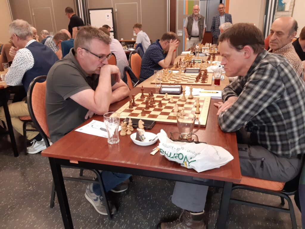 Omdat we vandaag een centrale slotronde in Helden hebben, zijn er massa’s bekenden om mee bij te praten. Het goede weer is al geregeld. Het bier staat koud. Nu moet ik alleen zorgen dat ik niet tot het diner achter het bord moet zitten. Dat lukte dit keer wonderbaarlijk goed. Net voor drie uur krijg ik een remiseaanbod van mijn tegenstander, een van de gevaarlijkste spelers van Reuver. In mijn ooghoeken zie ik, dat Roger zojuist gewonnen heeft. Er is bij mij veel geruild en de stelling is grotendeels dichtgeschoven. Vooruit dan maar, dit keer eens niet tot de kale koningen doorspelen (ik heb met mezelf recent afgesproken vooral bezig te zijn met “lekker schaken”).