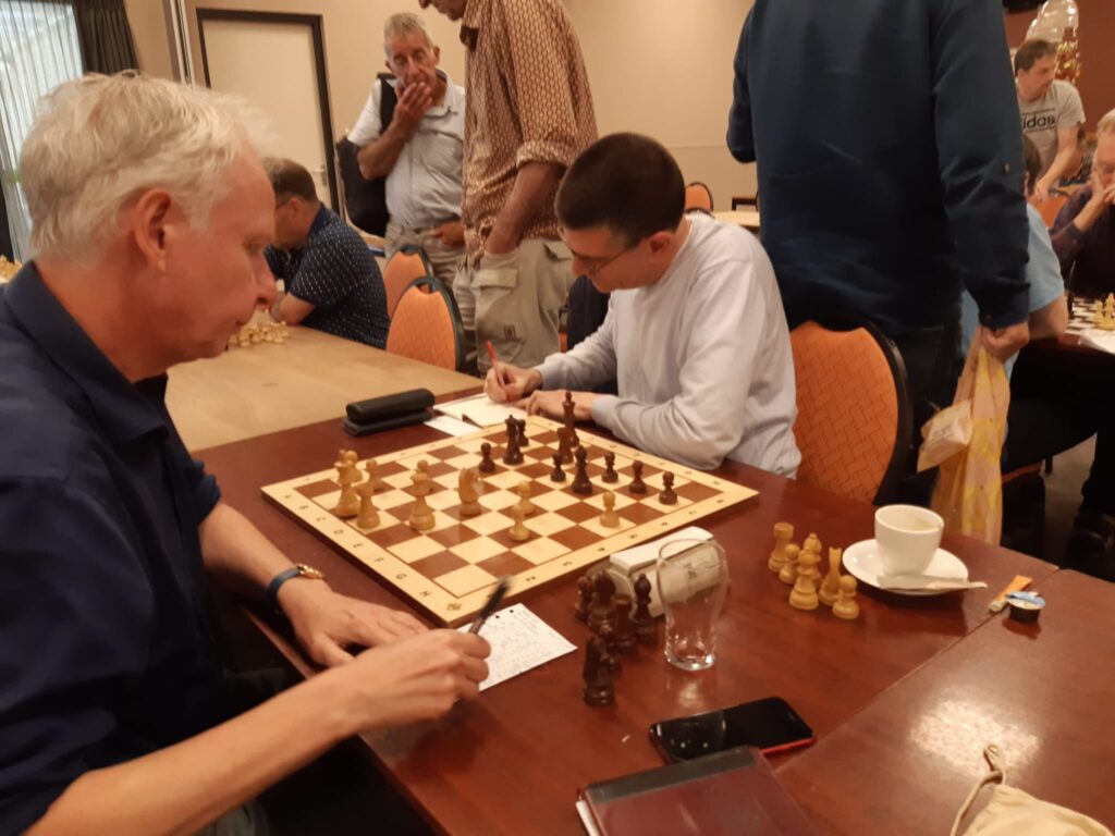 Bij de laatste twee partijen kregen onze spelers beduidend meer speeltijd voor hun contributie. Bob speelde tegen Jan van Rens, ongetwijfeld veelvuldig clubkampioen van Reuver, die ondanks zijn leeftijd nog altijd een gevaarlijke tegenstander is. Bob probeerde het een tijd en sloeg ook een remiseaanbod af. Uiteindelijk werd het toch remise. Daarmee kwam de tussenstand op 4-1.