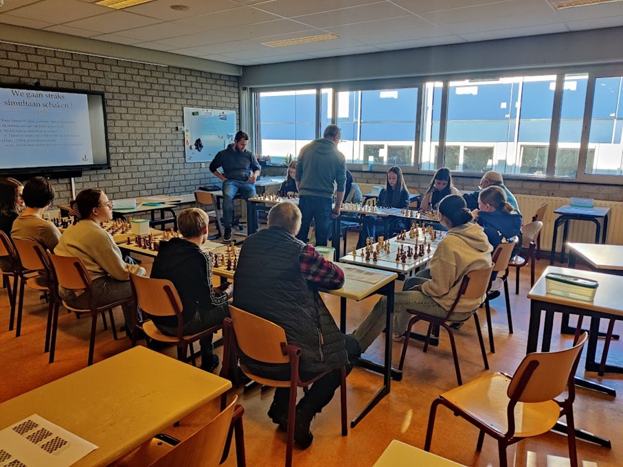 Op woensdag 26 februari hebben we samen met de Schaakvereniging Schaesberg een schaakworkshop gegeven bij Compass, een middelbare school in Brunssum. Er waren 20 leerlingen aanwezig. We begonnen met een filmpje met leuke vragen en daarna de uitleg over de loop van de stukken. Hierna gaven Hans Ypma en Henk Gommer in 2 deelgroepen een “praat”-simultaan, waarbij de simultaangevers veel praten en de spelers uitdagen, stimuleren.