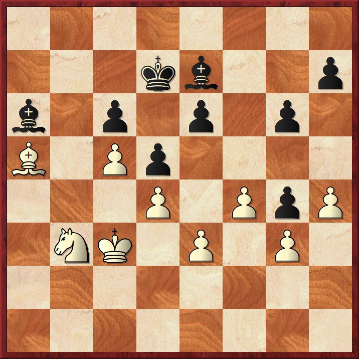 De druk is inmiddels verdwenen, maar na bijvoorbeeld Kd2 is er weinig aan de hand. Zich niet bewust van de vreselijke dreiging speelde Leon Pc1?? en Rob sloeg toe met Lxh4! De loper is taboe wegens promotie van de g-pion en omdat de loper nu ook nog doorslaat op g3 gaf Leon onmiddellijk op.