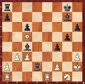 Black to move. Als de loper van c5 weg zou zijn dan heeft dit desastreuze gevolgen voor wit, want dan is Rxf2, Kh1, Bd5, Nf3, Bxf3 een groot probleem. TT speelt hier Bf8, met als doel om de loper weg te lokken, deze bovengenoemde combinatie uit te voeren met schaak en vervolgens de loper op f8 terug te snoepen. Gert negeert de Mexican Bishop stand-off en speelt Rad1. Hij valt een loper aan en ik val een toren aan. Ties speelt hier R8d8. Een automatisch zetje wat in eerste instantie goed lijkt. Gert speelt Rxd2 en langzaam maar zeker begint het een en ander te dagen in de bovenkamer van de zwartspeler. Dan komt het besef: TT is geoutT’d. Rxd2 Re8 komt op het bord en de pion op f2 is verdedigd door de loper op c5 die niet geslagen kan worden, want de loper op f8 is gepend en wordt twee keer aangevallen. Niets kan de zwarte stelling nog redden en na twee zetten is capituleren het enige wat zwart nog rest. 1-0 V1 en GerT wint van Ties die vanaf nu weer gewoon Ties is. Gerts ongeslagen status blijft behouden en bekroond zijn rentree na 4 jaar afwezigheid met een mooie overwinning. De Toon is gezeT. 1-0.