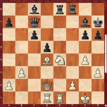 Op bord 2 speelt Roger tegen Sander. Een rossolimootje komt op het bord en Sander heeft een ontwikkelingsvoorsprong en centraliseert al zijn stukken. Roger reageert tijdig met de juiste actieve zetten en Sander mist wat nuances om wat druk uit te oefenen. De onderstaande stelling komt op het bord. Zwart heeft net d5 gespeeld. De witspeler zit tegenwoordig dagelijks aan enorme hoeveelheden middlegame tactics, want dit heeft hem al een paar keer punten gekost. Hier spot Sander Nf6, Bxf6, Rxe8, Rxe8, Bxf6. De belangrijkste verdediger van zwart is afgeruild en de belangrijkste aanvaller van wit staat nog op het bord. Of dit waarde heeft hangt helemaal af of de witte dame op de diagonaal van a1 naar h8 kan komen. In de praktijk blijkt dat een nauwkeurige Re4 dit onmogelijk maakt en een remise is onvermijdelijk, want de zware stukken gaan er op de e lijn vanaf. In het weglopen komt een getergde, van zijn tricky titel gestripte Ties naar Sander toe. Ties had een dubbel kwaliteitoffer gezien die door beide spelers gemist was, maar meteen heel interessant klinkt. Hier komt die: Nf6, Bxf6, Rxe8, Bxd4!, Rxf8, Qg3. Dit is minimaal een draw vanwege eeuwig schaak op de g en h lijn. Computers kunnen echter nog verder rekenen en dit blijkt zelfs winnend te zijn. Hiervoor moeten wel een paar zetten worden gevonden die rechtstreeks uit het sprookjesbos komen. Lets go. Nf6, Bxf6, Rxe8, Bxd4!, Rxf8, Qg3, Kh1, Qxh3, Kg1, Qxg4, Kh1, Qh3, Kg1, Be5, f4, Bd6! Hier valt zwart de toren op f8 aan en dreigt tegelijkertijd Bb6 gevolgd door Ba6. Dit schijnt noodlottig te zijn. De lopers zijn samen te sterk en wit verliest te veel materiaal. Als Ties dit gezien had zou hij meteen weer gepromoveerd worden tot TT, maar helaas. Desalniettemin mijn complimenten. Nog meer tactics oefenen voor Sander dus en hopelijk komt hij dan ooit op het level van Ties. V1 1.5 – V2 0.5.