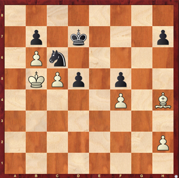 Ger heeft goed verdedigd en de volgende stelling staat op het bord. Ingrid plaatst hier een remise-aanbod bij. Wellicht om Ger in de war te brengen. Zwart kan nu doen wat hij wilt de pionnen en het paard vormen een muur. Ger kiest ervoor om naar de koningsvleugel te lopen, maar beseft twee dingen. 1: als wit h3 speelt en de loper op f2 zet komt zwart er ook nooit door vanwege een witte muur. 2: Nd4 check en het paard kan de witte stelling in springen. Ingrid speelt de loper terug en het is remise. V1 2 – V2 1.
