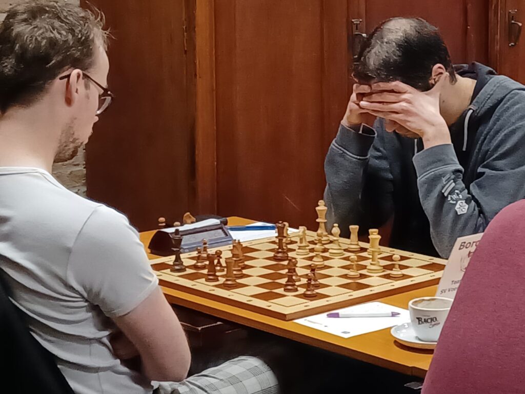 Gino (bord 1 met zwart) speelde aan het spitsbord tegen GM Martijn Dambacher een heel interessante partij.  Wit kreeg een klein “wit-voordeeltje” uit de opening maar er was lang weinig aan de hand en Gino speelde goed mee. Wit opende het centrum voor activiteit maar kreeg daardoor wel een klassieke geïsoleerde d-pion. In deze fase was plots elke zet uiterst belangrijk. De stelling was heel gecompliceerd en beide spelers misten hun beste kansen. De laatste schermutseling was dat zwart een geslagen pion kon terugnemen maar dan leek hij een kwaliteit te verliezen. Een diepe tegentruuk zou dit echter voorkomen hebben en een goede stelling hebben opgeleverd. Gino zag het niet, sloeg de pion niet terug maar dit gaf wit twee verbonden oprukkende vrijpionnen en een winnende stelling. Uiteindelijk liep het zelfs snel mat.