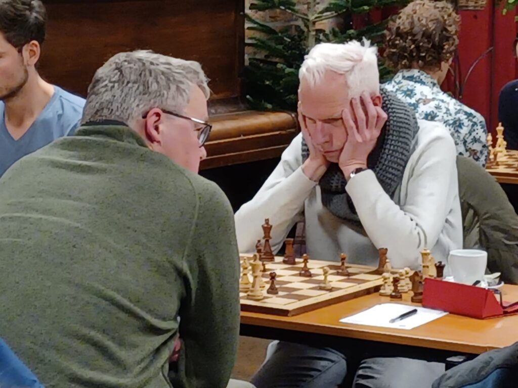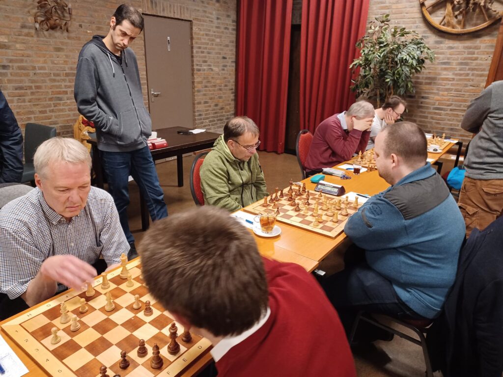 Ruud (bord 7 met zwart) offerde in de opening een pion voor initiatief op de damevleugel. Wit kon zijn stukken niet optimaal coördineren, zwart wel, en dit leidde tot progressief voordeel voor Ruud tot zelfs gewonnen stelling. Maar het was niet makkelijk door te breken en Ruud stond nog steeds die pion achter. Het zwarte initiatief liep niet direct heel slecht af voor wit. Ruud won wel de pion terug en hield druk maar er waren intussen wel veel stukken geruild. Hij kreeg nog een kans op pionwinst maar dat was niet zo makkelijk te zien. Zoals het ging werd het snel gelijkspel en remise. Mooie partij van Ruud maar toch een gemist kansje op meer.