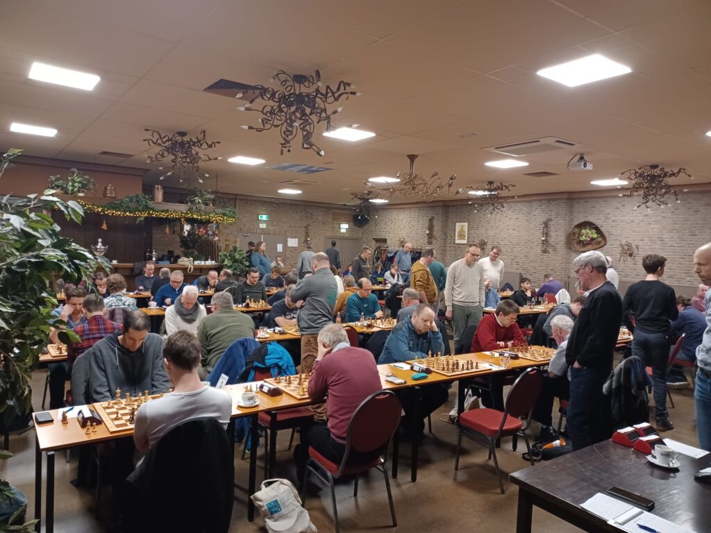 Luc (bord 4 met wit) was als eerste klaar met een korte remise. Zwart speelde een wat speculatieve opening maar Luc werd niet verrast en kwam wat beter uit de opening, genoeg voor zijn sterkere tegenstander om remise overeen te komen. Misschien moet Luc toch meer doorspelen in deze situaties?