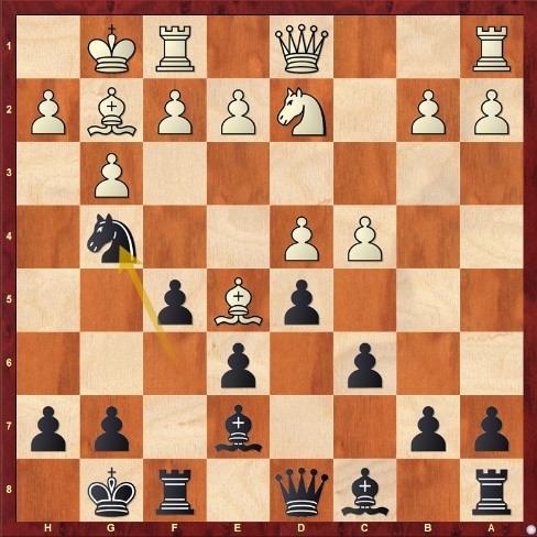Hier volgt 12: Lf4, g5 13: Le5, Pxe5 14: dxe5. Hier kan zwart een pion winnen met Dc7, want als wit f4 speelt om deze te verdedigen wint Db6+ de pion op b2.