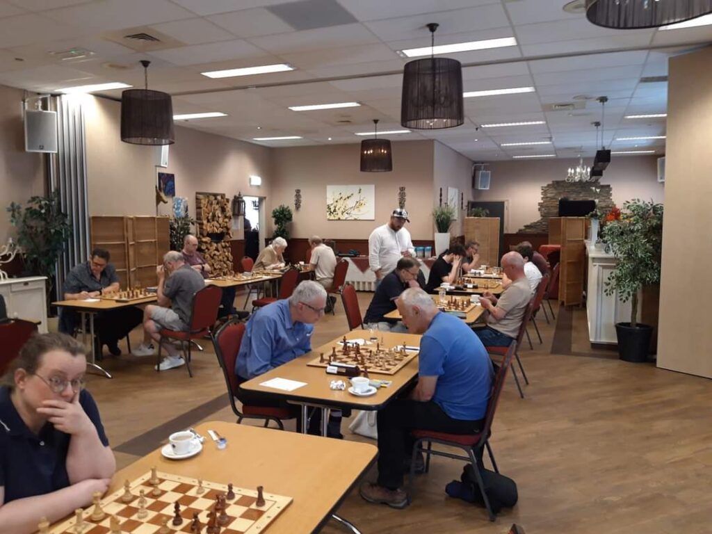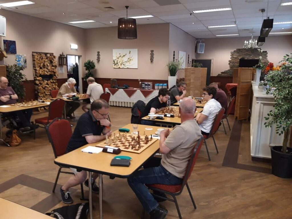 Van de vaste kern van 8 spelers (er spelen steeds zestallen) waren Tom Vrouenraets, Maarten-Jan Oosterman en Frans Lipperts verhinderd, waardoor de schrijver van dit artikel mocht invallen. Onder de bevlogen leiding van arbiter Rick Wagemakers en assistente Claudia begonnen de 24 spelers (ook de schakers van Voerendaal 1 en De Juiste -Z- 1 speelden deze middag hun onderlinge competitiewedstrijd in de Davidzaal van De Borenburg) aan hun partijen, ondanks het mooie weer en Moederdag.