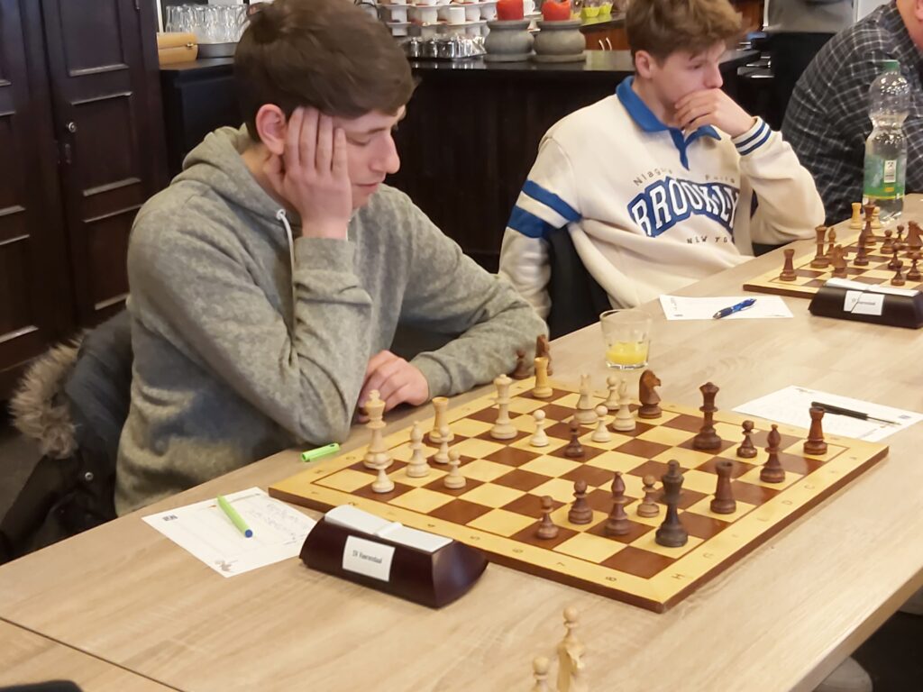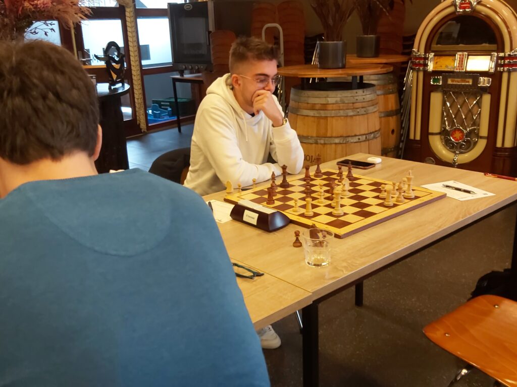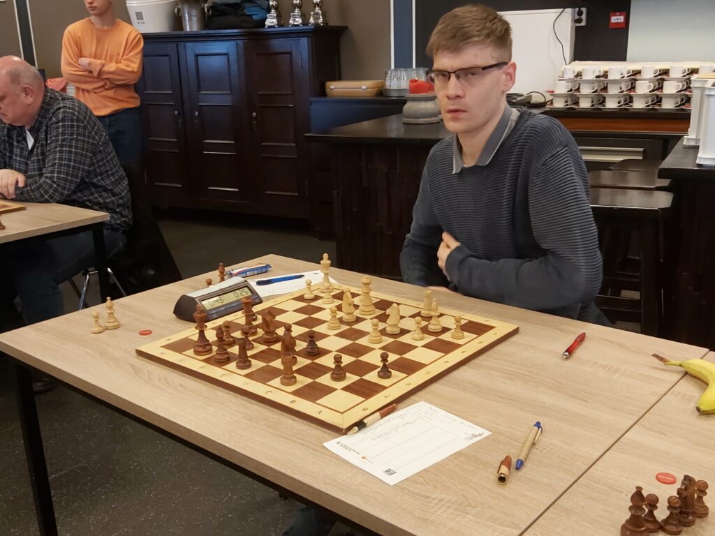 Na lang voor gestaan te hebben maakt Max Warmerdam de gelijkmaker tegen Siem. Max speelde een zeer goede partij met het logische resultaat van een vol punt voor hem. Siem weerde zich kranig maar na 27…Lxe4 ging de partij de verkeerde kant uit. Max maakte hierna goed gebruik van de ongelijke lopers. (3-3)