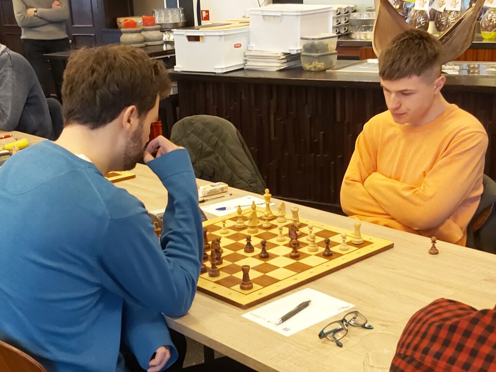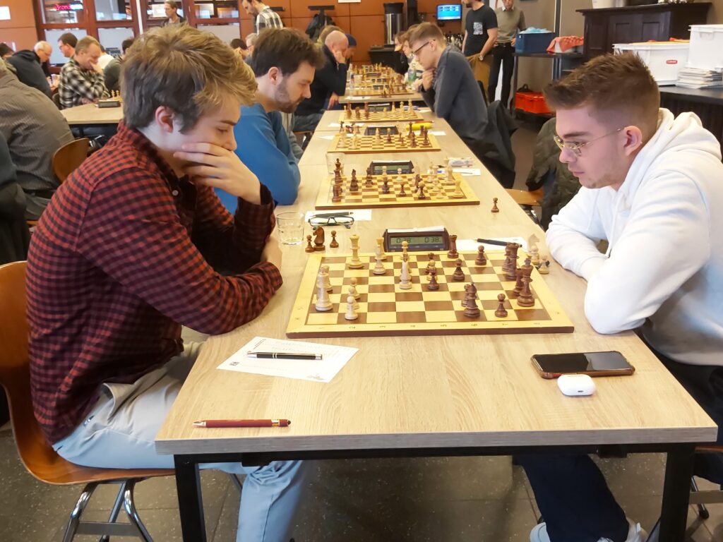 Voorafgaand aan de wedstrijd kregen we het verzoek of Thomas Beerdsen vooruit kon spelen zodat hij zijn GM norm kan veiligstellen. Thomas had 7 uit 7! En hoeft alleen nog maar 2 partijen te spelen tegen sterke spelers om de volgende Nederlandse GM te worden. Christian gaf aan graag tegen Thomas te spelen. Christian speelde een prachtige partij (zeker het nakijken waard) en won in een prachtige stijl van Thomas. (1-0)