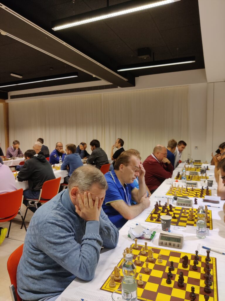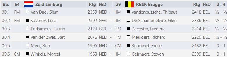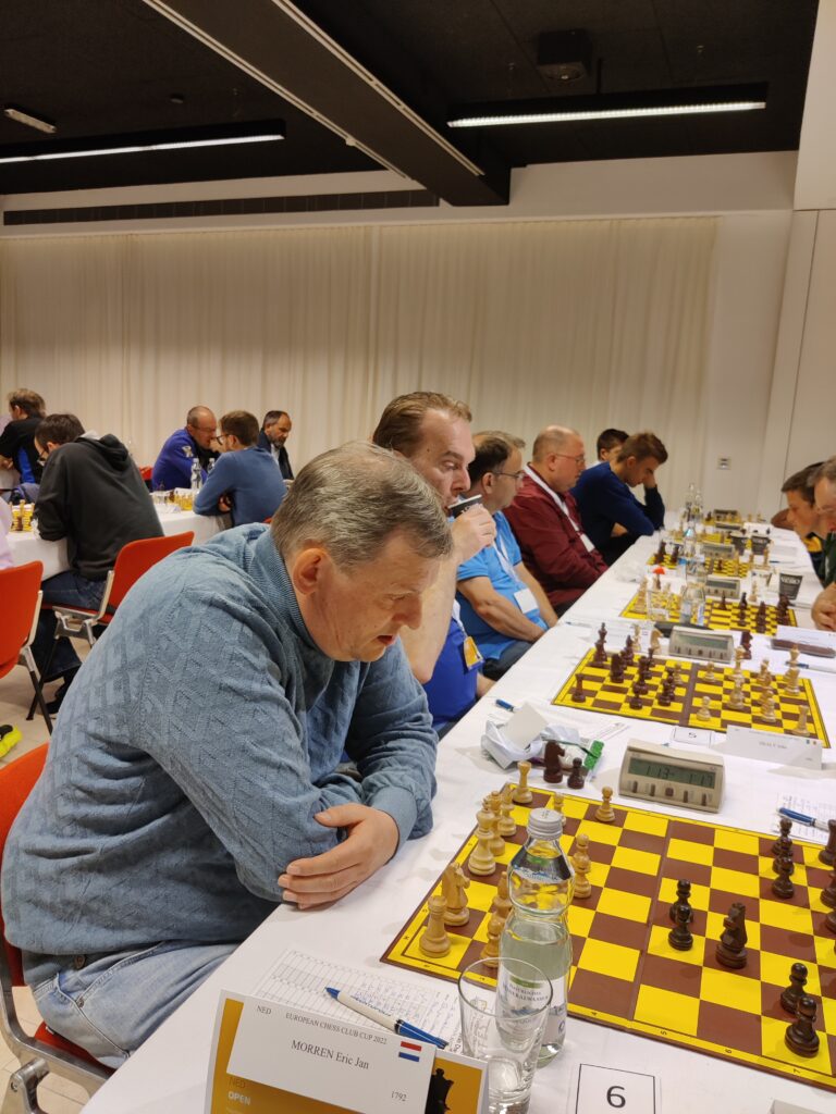 In de eerste ronde speelden we tegen de Belgische buren van KBSK Brugge. We speelden met de eerste 6 spelers, dus Eric Jan mocht in het hotel gerust nog voor zijn werkgever aan de slag. Het werd een eervolle 2-4 nederlaag met 4 keurige remises aan de eerste 4 borden.