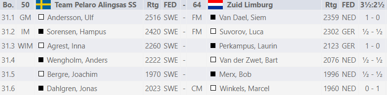 Siem mocht op de woensdag tegen een echte legende spelen, namelijk Ulf Andersson, voormalig nummer 4 van de wereld (in de jaren 70). De Zweed was het topbord van Team Pelaro Alingsas SS uit zijn vaderland. De nestor had wit en van tevoren grapten we al over een eindspel van goed paard en slechte loper (zijn specialiteit), dat er op het bord zou komen. Dat gebeurde niet, maar wit haalde alle tactische grapjes uit de stelling en Siem werd positioneel van het bord gezet. Desondanks waren we dichtbij een gelijkspel tegen de Zweden, maar het werd een nipte 2½-3½-nederlaag (met een winstpartij van Marcel).