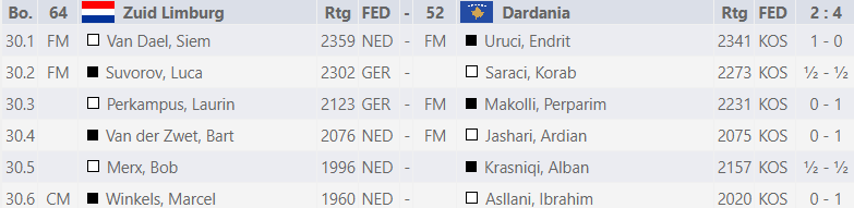 Voor de tweede keer speelden we (weer met de eerste 6) tegen Kosovaren, nu het team van Dardania. We vochten weer voor wat we waard waren, maar helaas zat er niet meer in dan een 2-4-nederlaag, met winst voor Siem en remises voor Luca en Bob.
