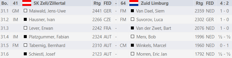 En toen zaten we alweer in het slotweekend! Tijdens de voorlaatste ronde, Laurin maakte vrijwillig plaats voor Eric Jan, mochten we aantreden tegen het officieus thuisspelende team, SK Zell/Zillertal. Ook dit team was, net als op 1 na alle tegenstanders tot nu toe, op papier sterker. En ze toverden voor deze wedstrijd nog een extra IM uit de hoge hoed. Desondanks werden we ons kranig en hielden de schade beperkt tot 2-4, waarbij deze keer de laatste 3 borden (Marcel 1 en Bob en Eric Jan halfjes) voor de punten zorgden.