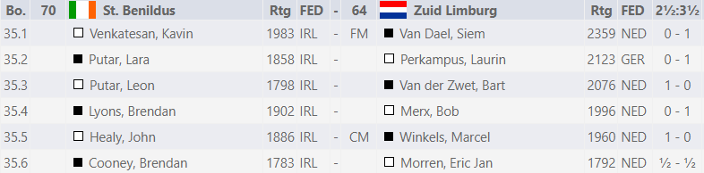 De laatste ronde op zondag 9 oktober begon dus al om 11 uur, zodat sommige teams al aan het einde van de dag naar huis konden reizen. Deze keer speelde Eric Jan i.p.v. Luca omdat laatstgenoemde op tijd naar huis wilde reizen met het oog op zijn studie. Indien de attente lezer een beetje de totaalscore heeft bijgehouden, dan is hij tot de conclusie gekomen dat we voor deze laatste ronde nog maar 2 matchpunten hadden. Daarom mochten we op de allerlaatste tafel spelen tegen het enige team met 0 matchpunten, namelijk St. Benildus uit Ierland. Dit gemengde team vol jeugd en ervaring bezorgde ons nog een lastige wedstrijd, maar we wisten uiteindelijk nipt met 3½-2½ te winnen. Siem, Laurin (was als laatste klaar) en Bob haalden een vol punt en Eric Jan een halfje.